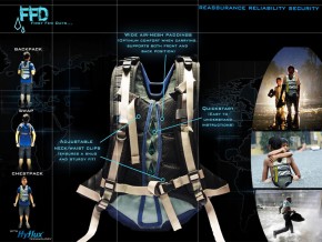 First Few Days is a backpack that can be worn during travel, evacuation or rescue missions and used to filter water for drinking. Very portable, the FFD backpack is designed also for comfort and easy of use. It is intended for victims of natural disasters as well as rescue workers, volunteers and even the military. The water filtration concept was developed to include electricity generation after watching victims of Hurricane Sandy search for outlets to charge their cell phones.